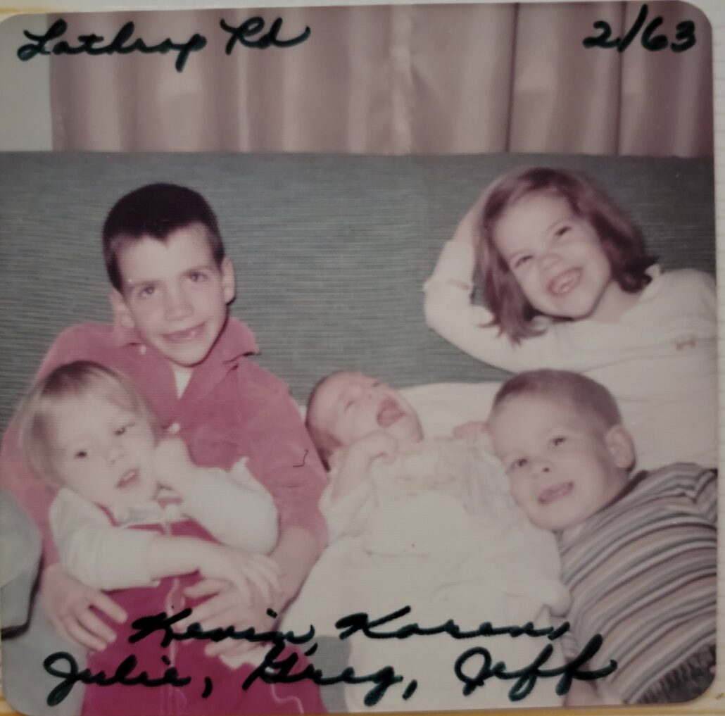 Kevin filled his shoes well as the oldest, and as the youngest sister, I think he felt compelled to teach me important life skills throughout the years. How to survive guerilla warfare that involved him digging a massive hole in the ground and standing on the far side of its opening, covered by weeds and grass, to see if I’d actually fall in. Kevin and my other older siblings, Karen and Jeff, spiced up the situation to challenge me to outrun our visiting friend, Gwen Thees out to the garden.